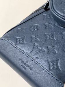 A standout feature is the detachable circular pouch, also in embossed Monogram leather, which adds both style and functional storage. The bag is equipped with multiple zippered compartments for organized storage of essentials.
