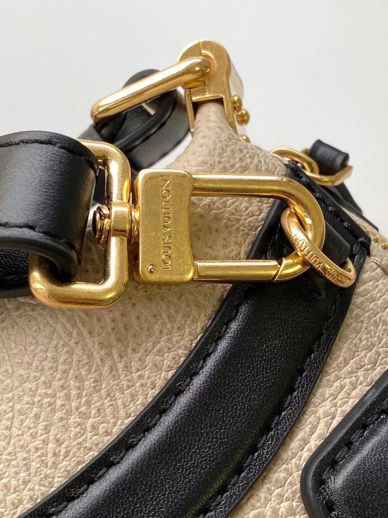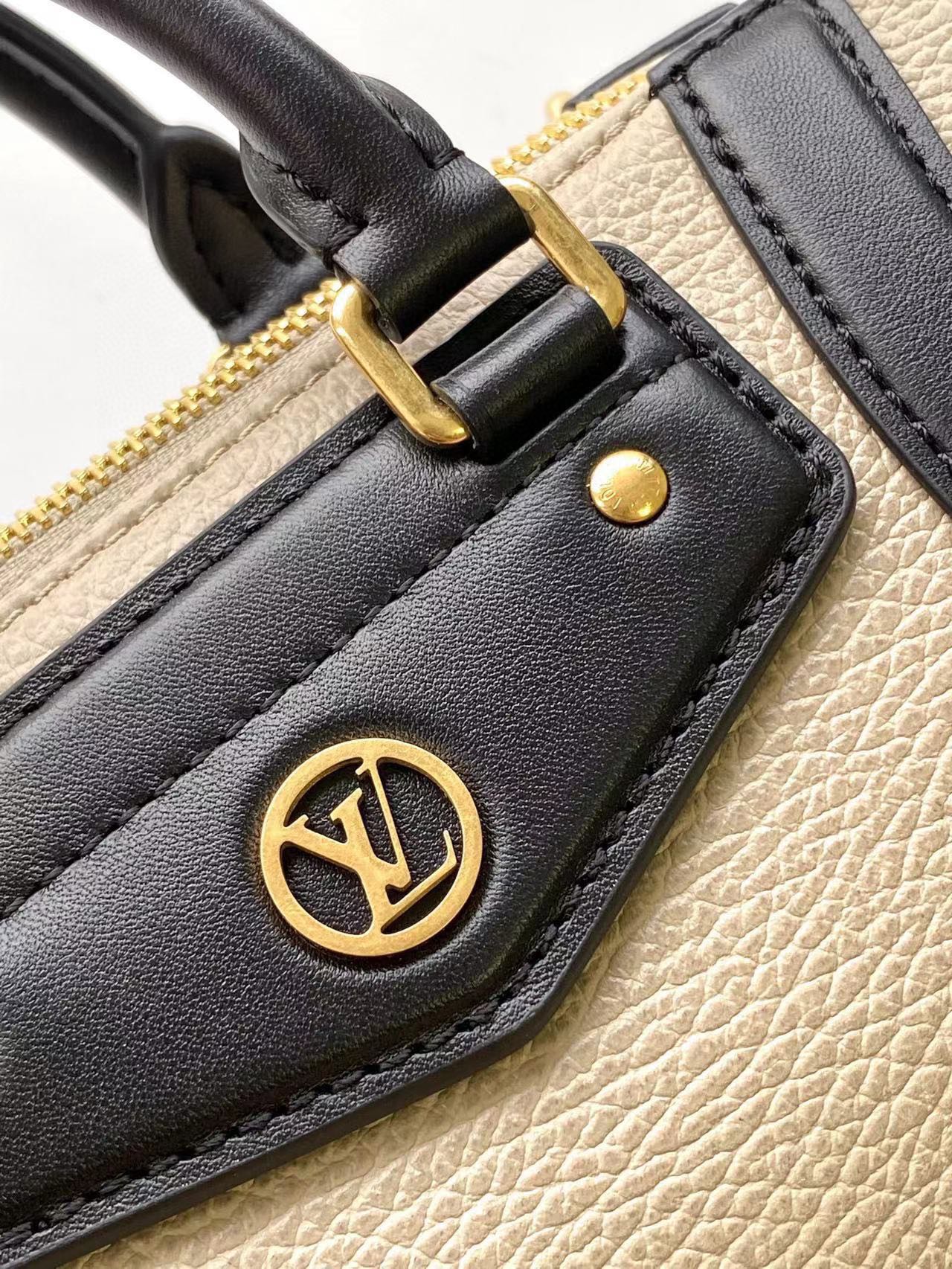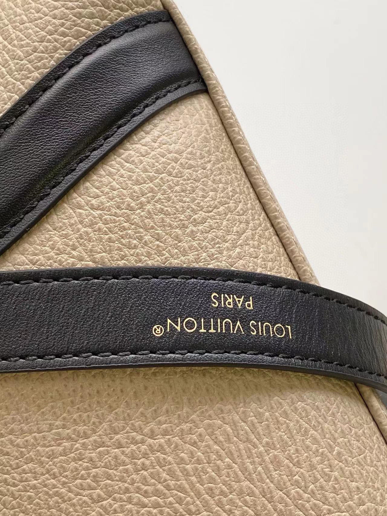• This is a Louis Vuitton small duffle-style handbag featuring a sleek two-tone design: a textured beige (or light taupe) leather main body paired with black leather accents (including the top handle, strap, and trim details).
