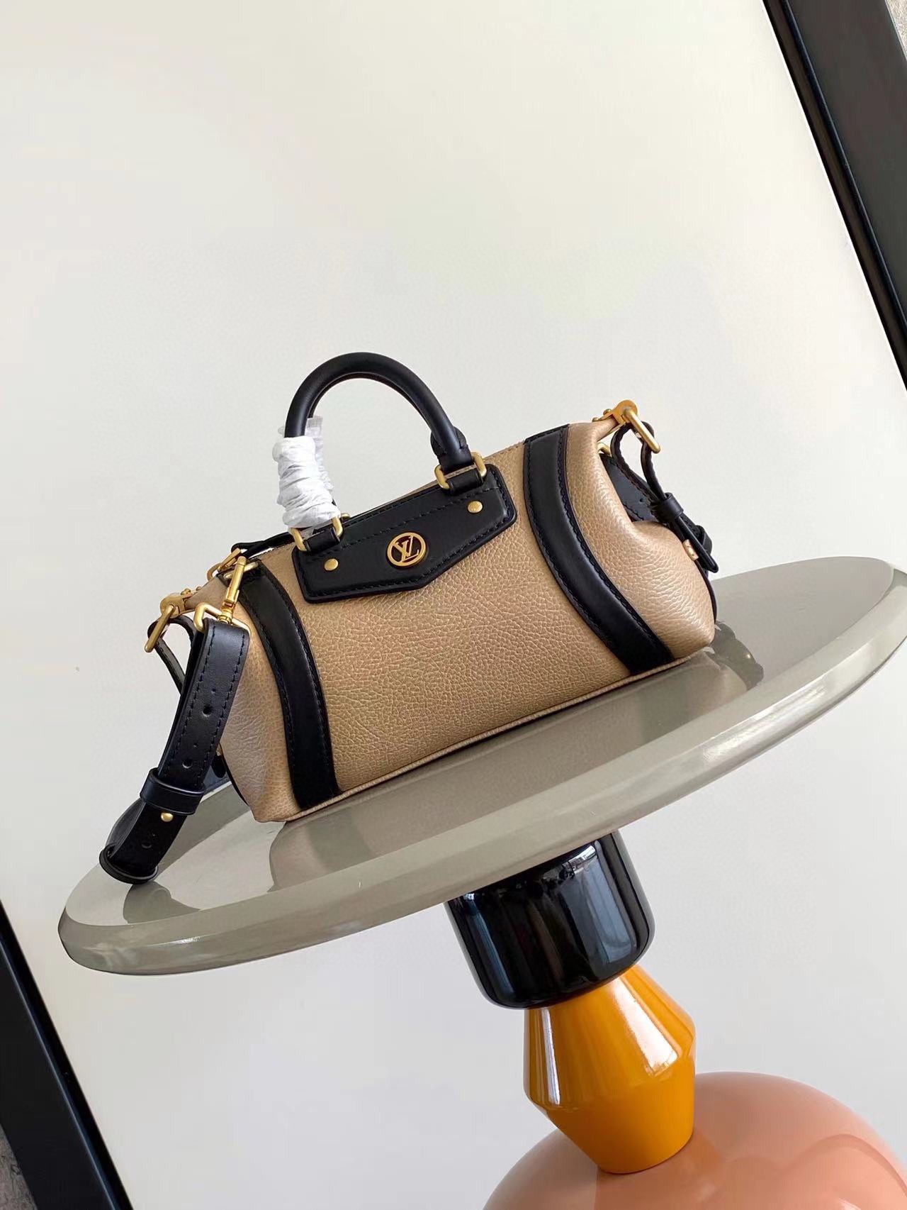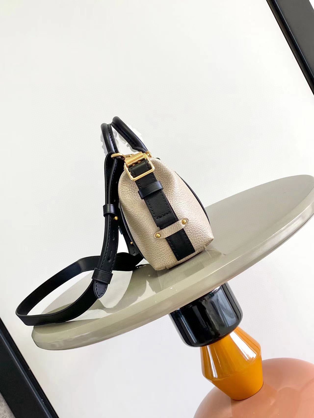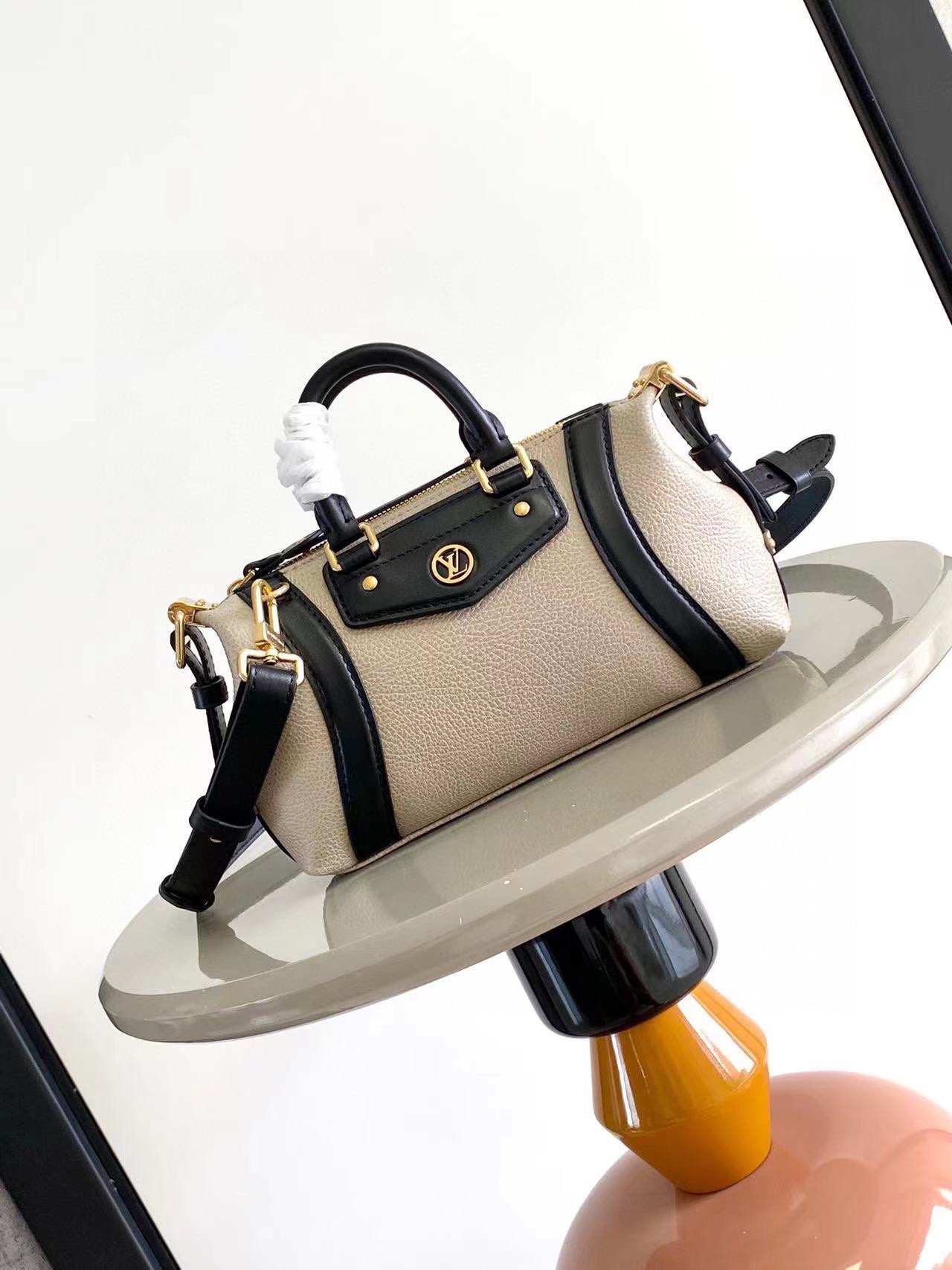 • This is a Louis Vuitton small duffle-style handbag featuring a sleek two-tone design: a textured beige (or light taupe) leather main body paired with black leather accents (including the top handle, strap, and trim details).