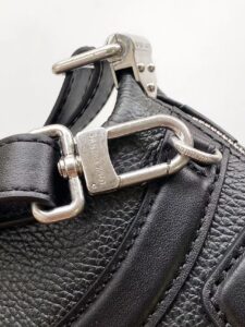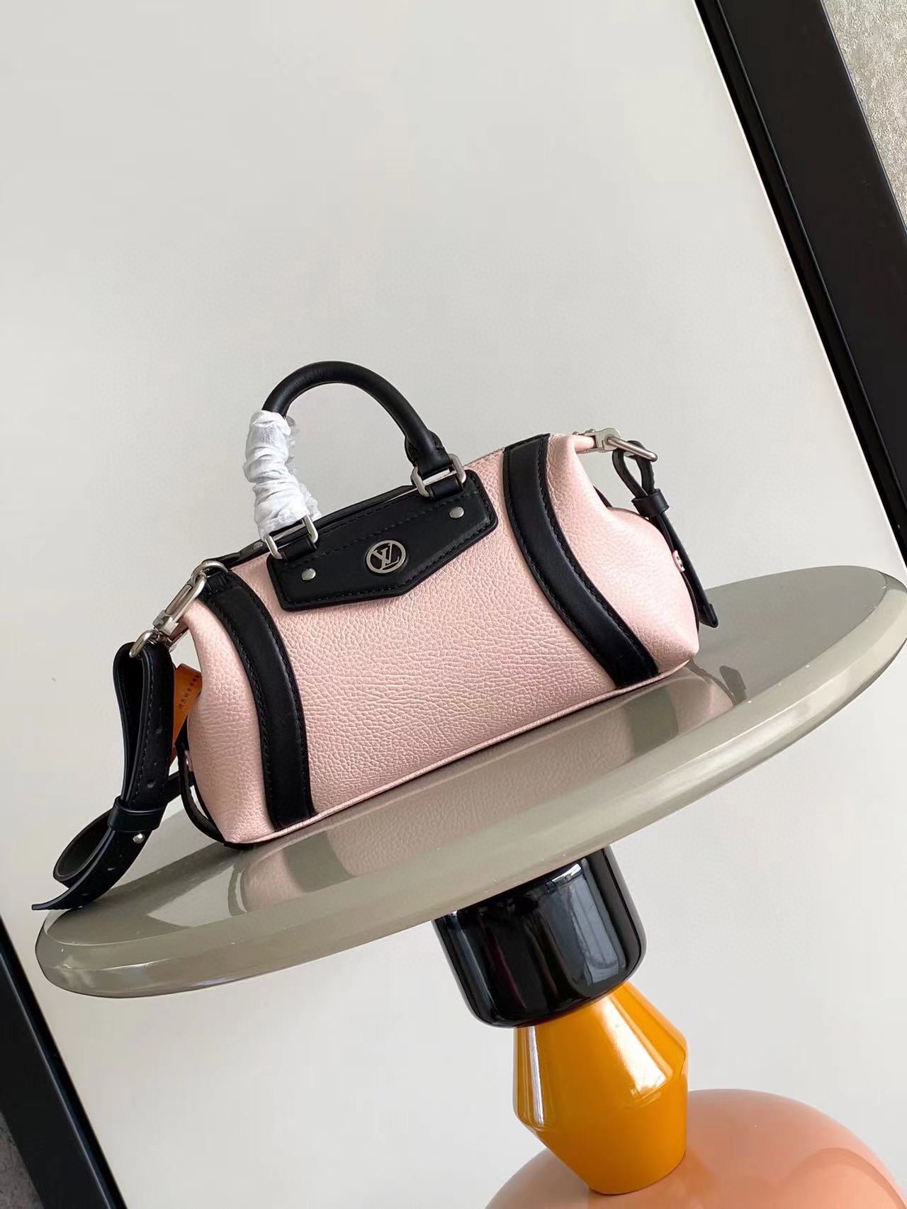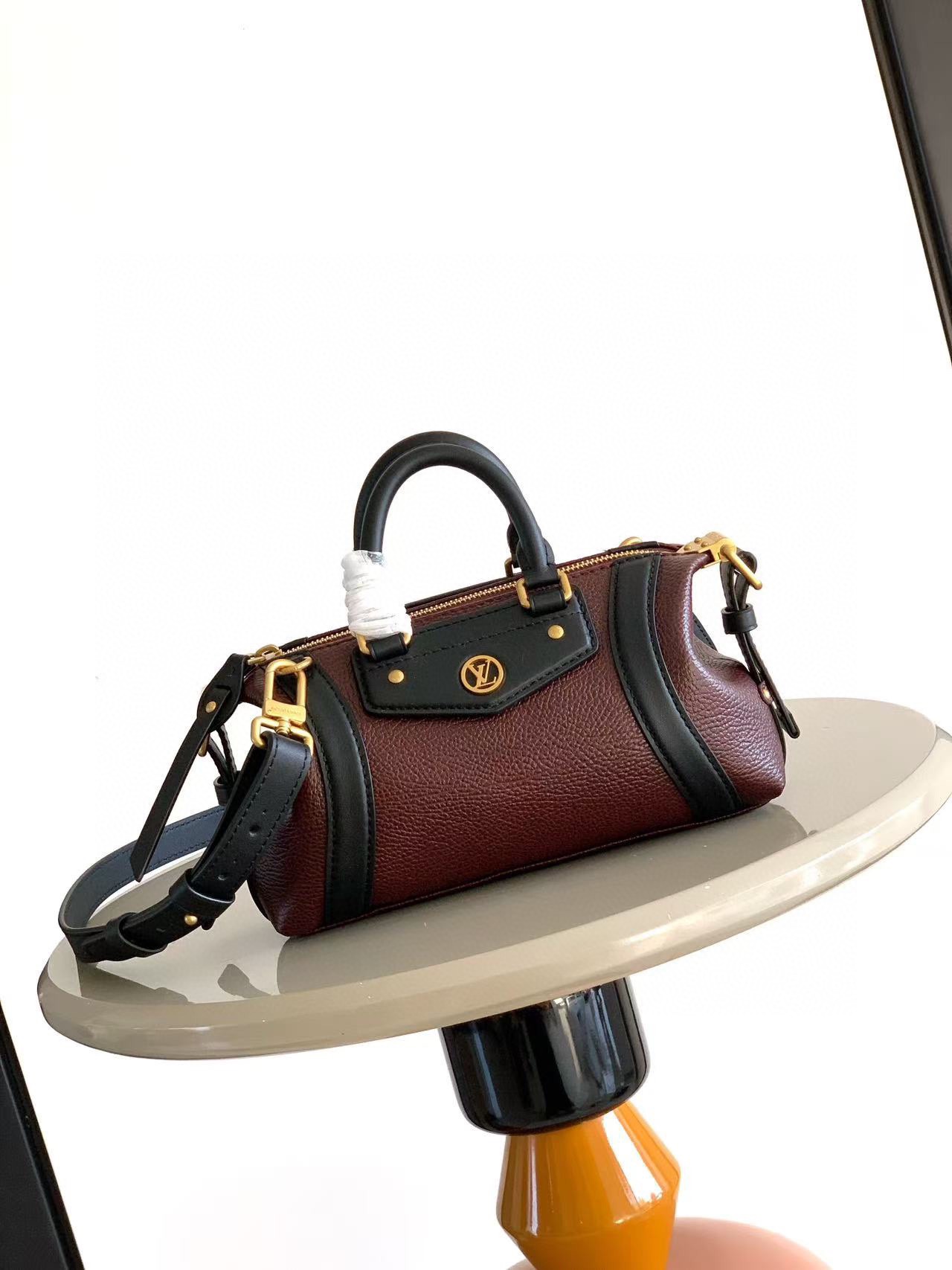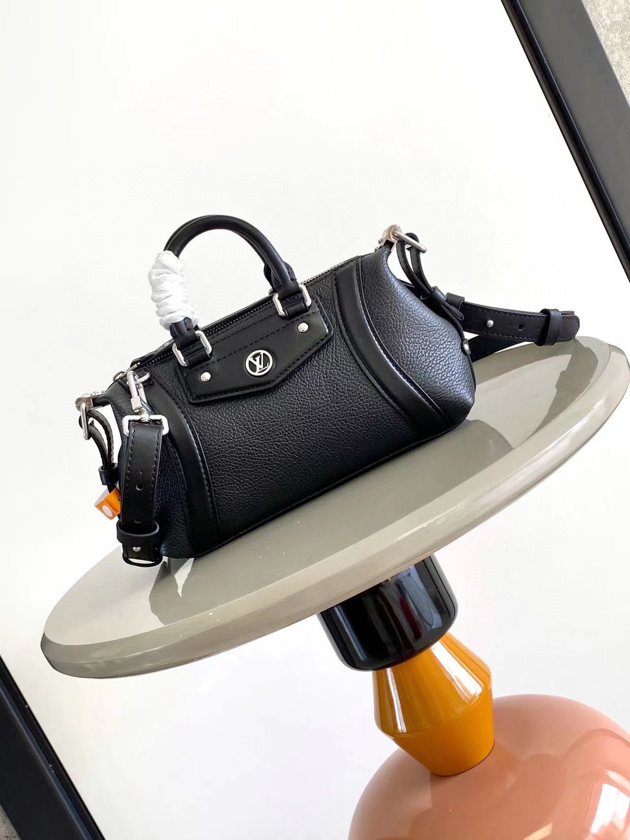 • The bag includes both a short top handle (with protective wrapping) and an adjustable black leather crossbody strap (engraved with “LOUIS VUITTON PARIS”), making it versatile for hand-carry or hands-free wear.