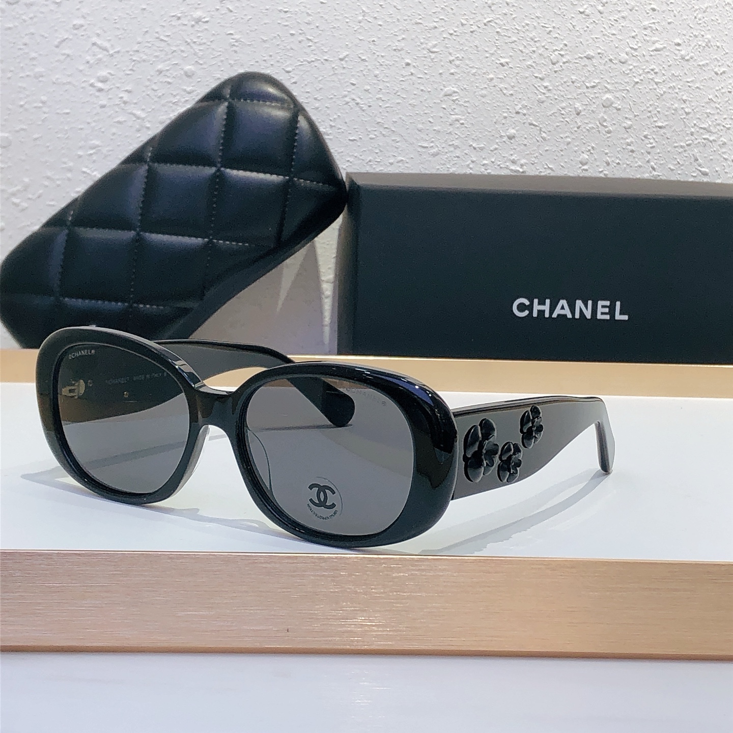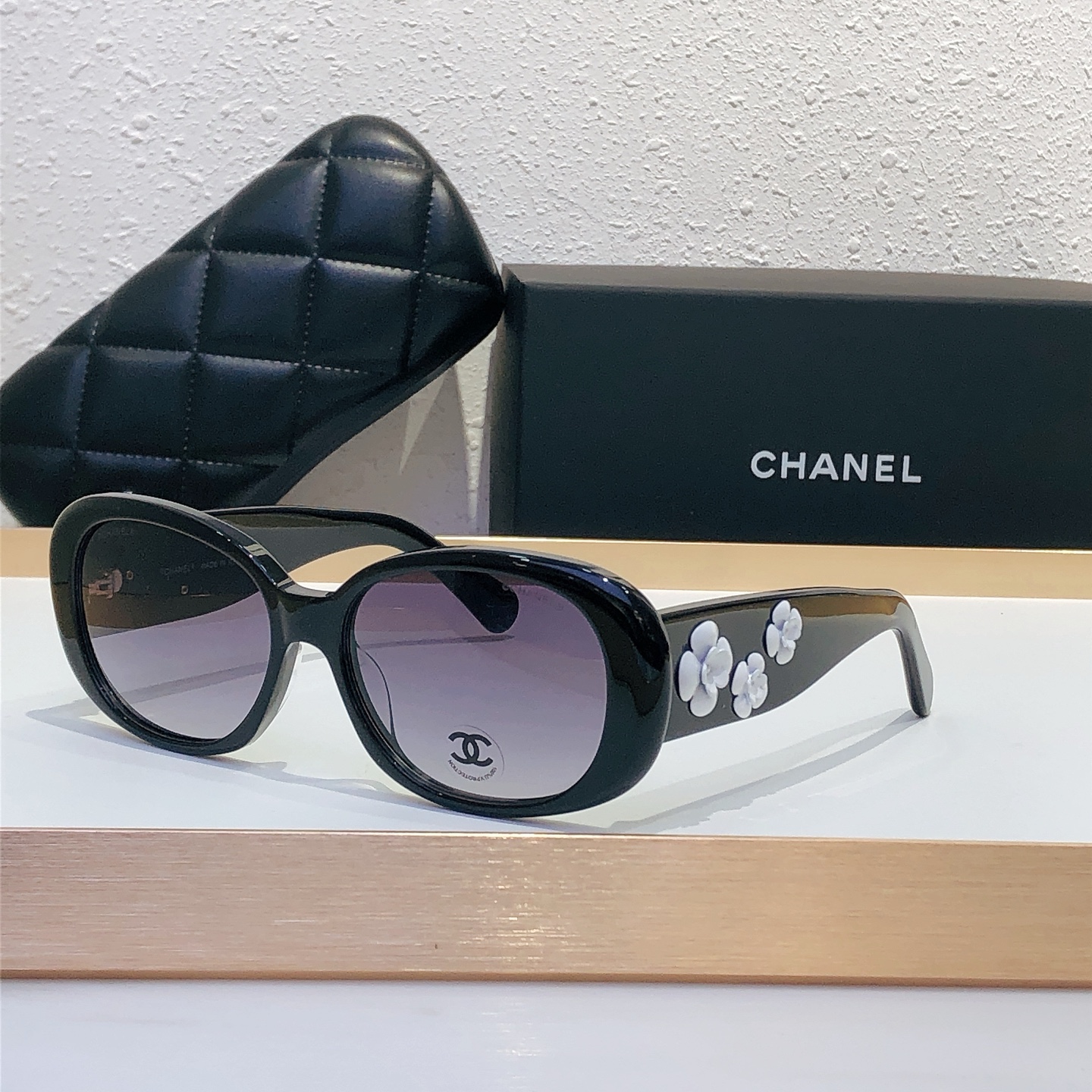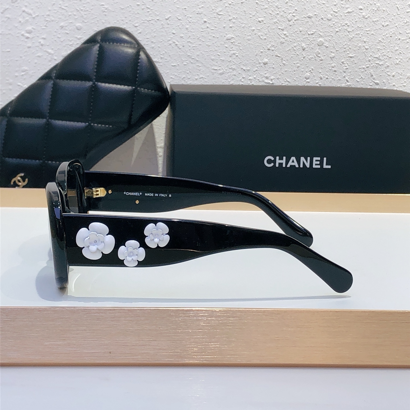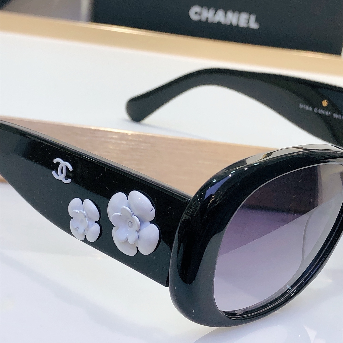 - These are Chanel sunglasses featuring the brand’s iconic design elements, including camellia flower embellishments on the temple arms.