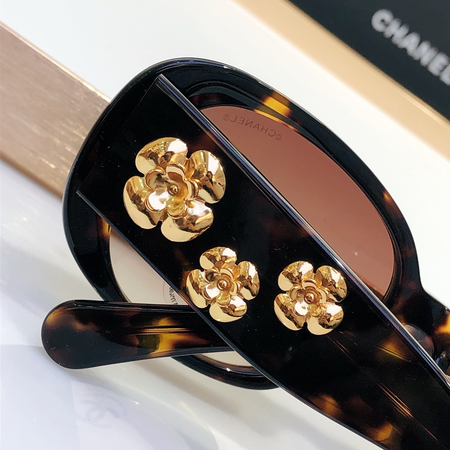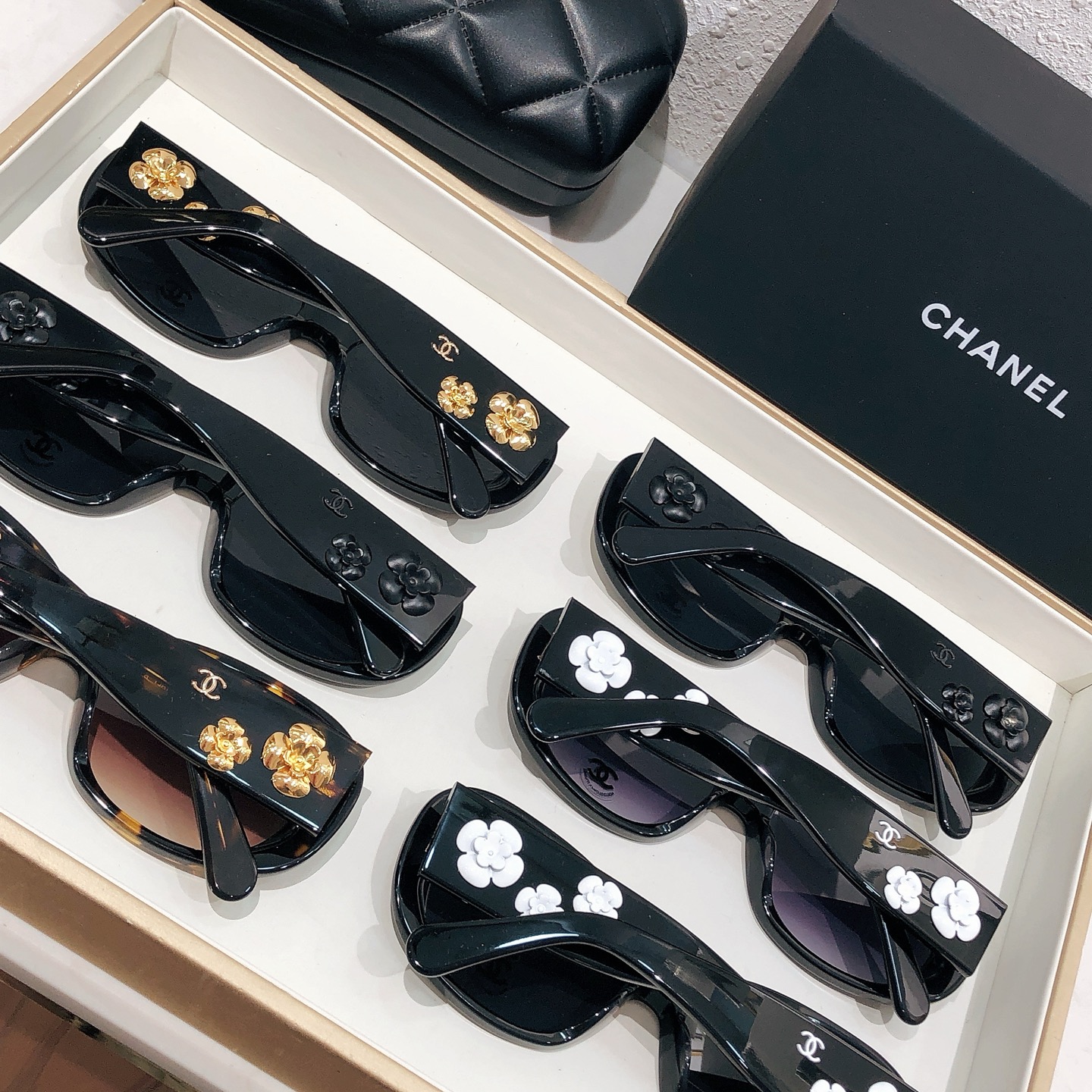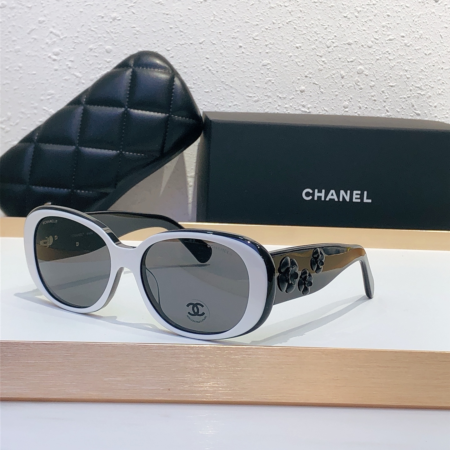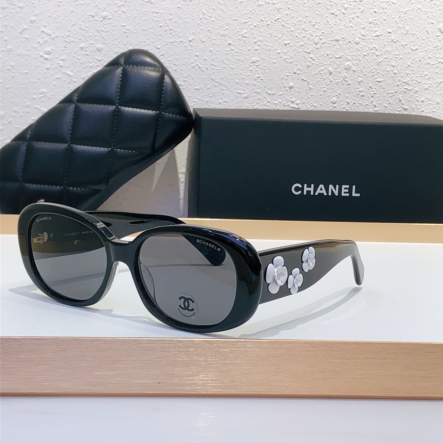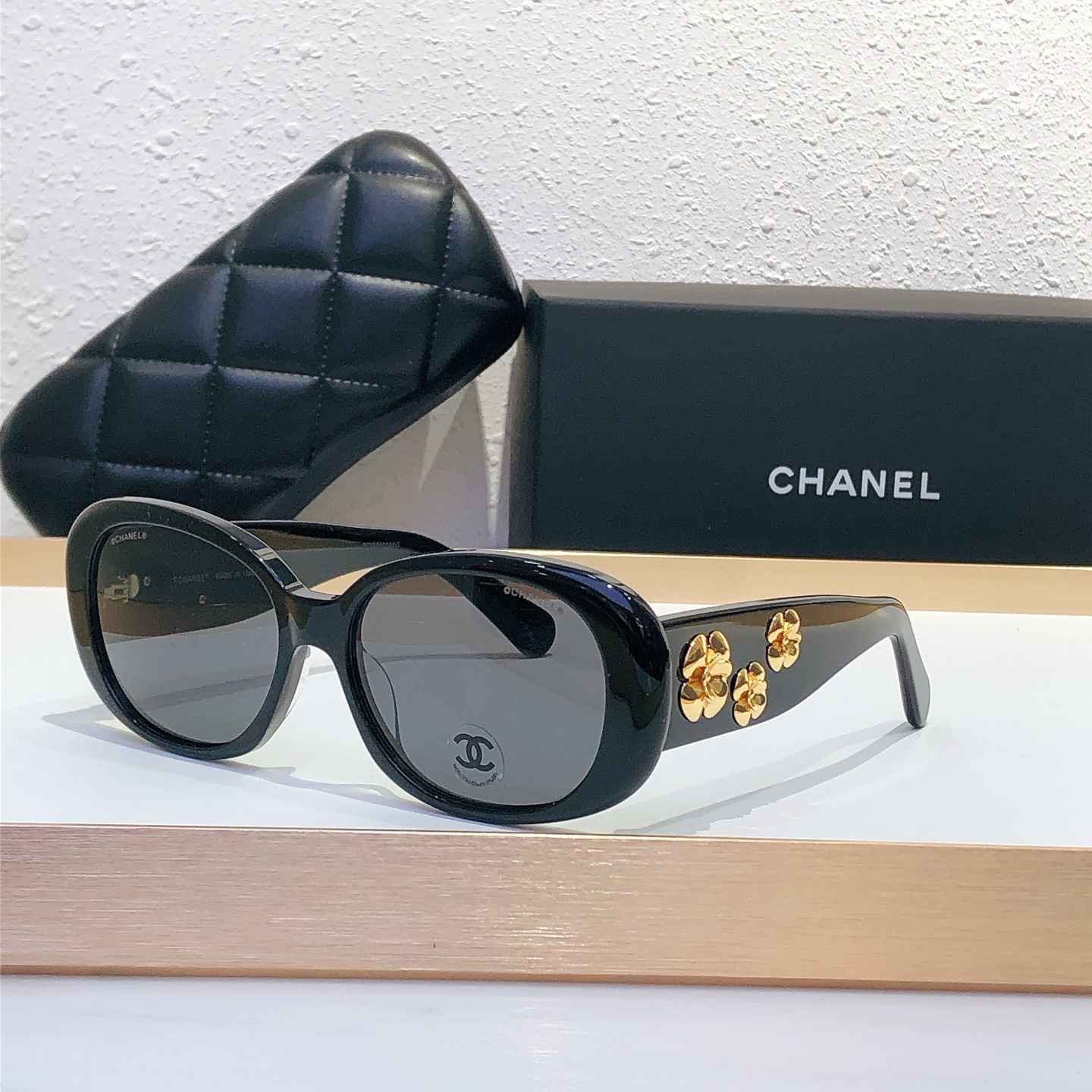 - These are Chanel sunglasses featuring the brand’s iconic design elements, including camellia flower embellishments on the temple arms.