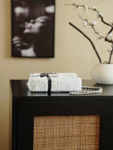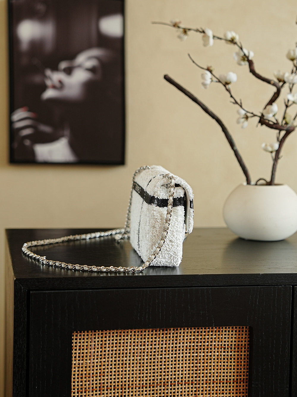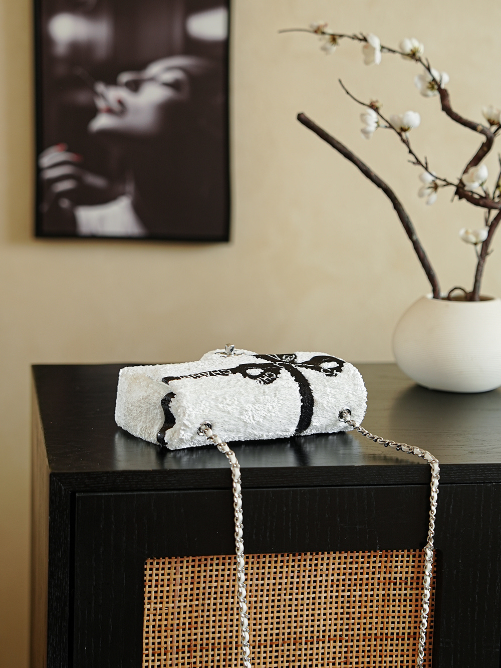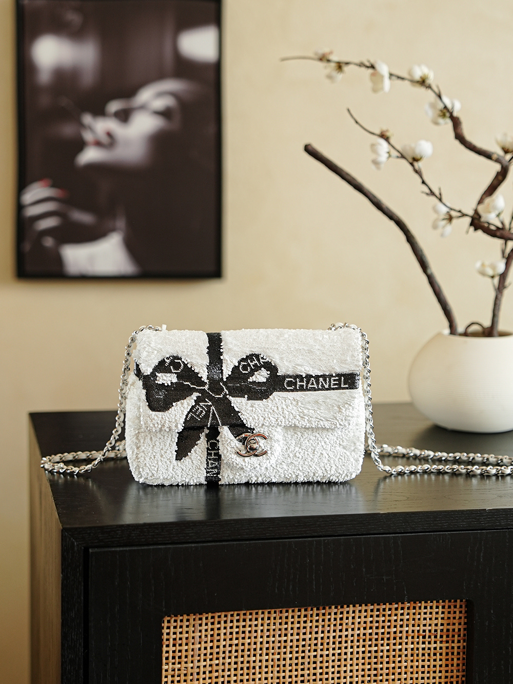 • Material & Pattern: Crafted from soft white tweed (or fuzzy fabric) entirely adorned with black sequins, forming a bold bow motif and “CHANEL” lettering. The contrast of the white base and black decorative details creates a eye-catching, whimsical look.