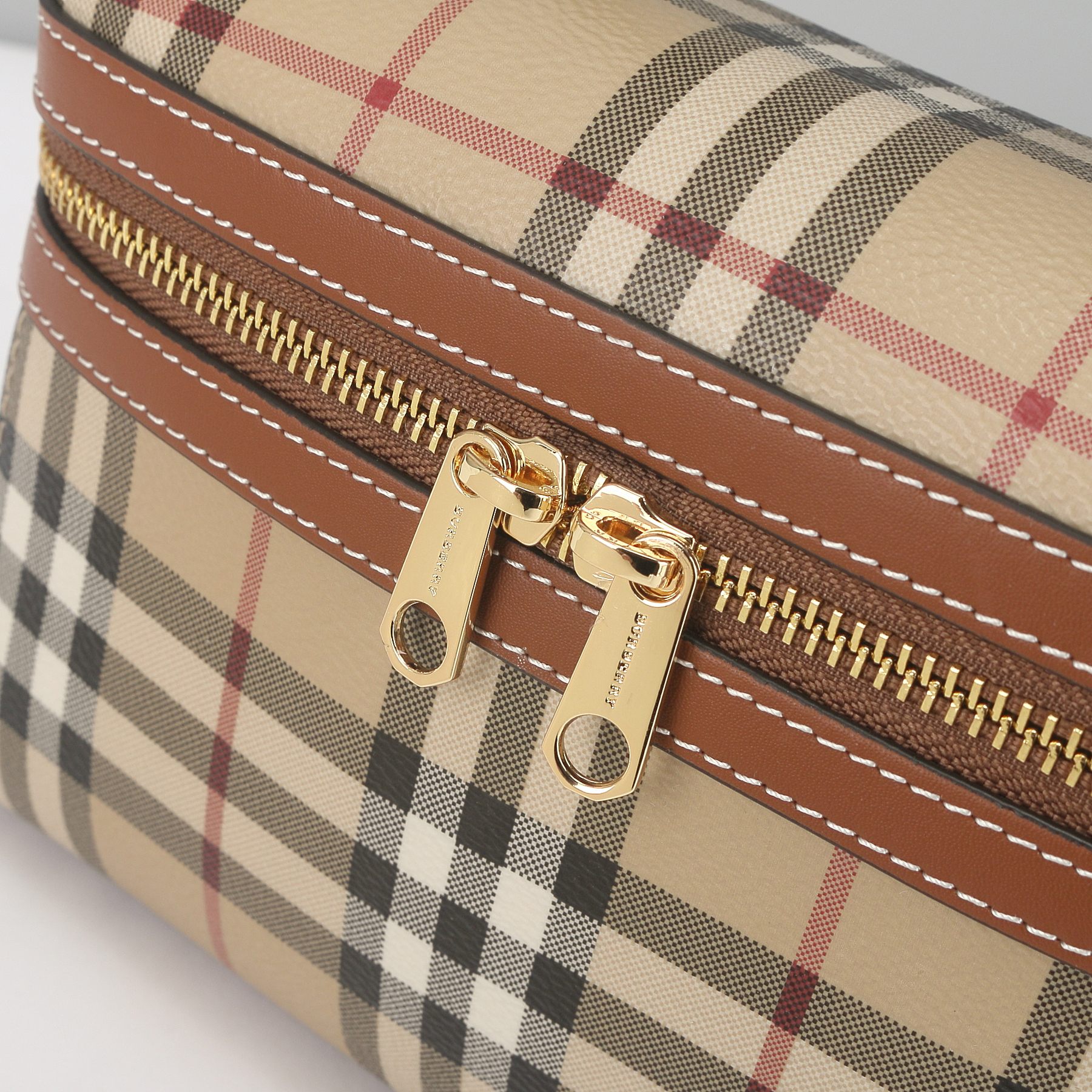 Signature details: The instantly recognizable Burberry check canvas + polished gold-tone hardware (including dual zip closures for secure storage)
