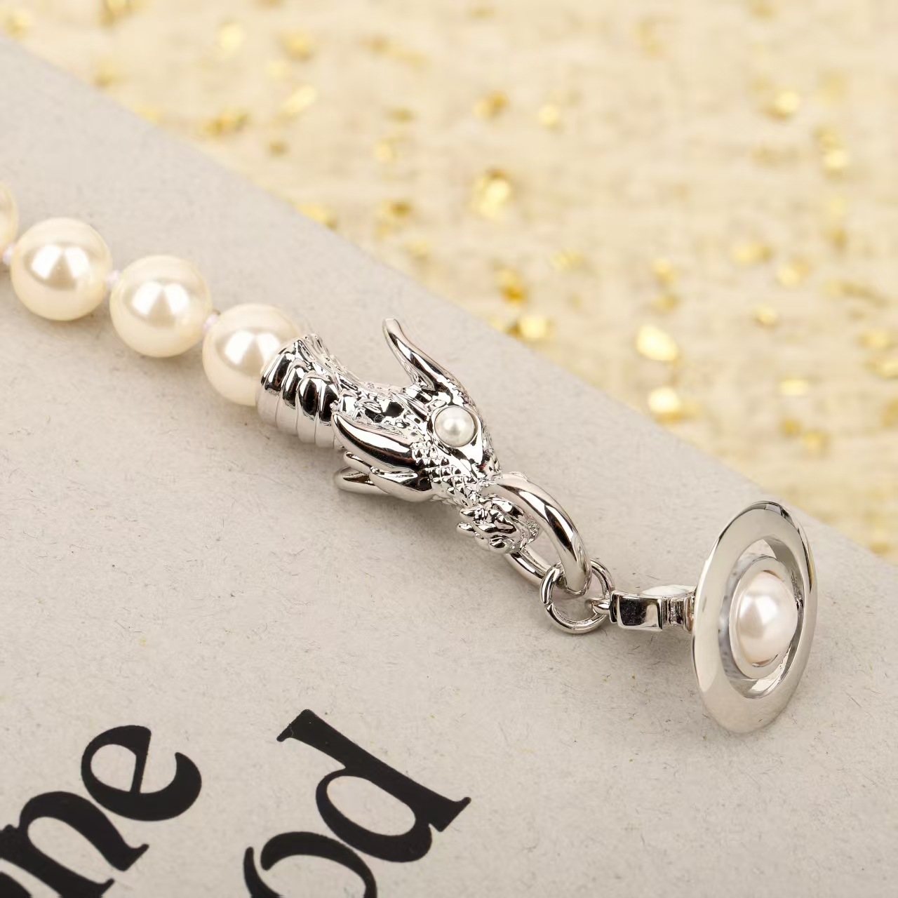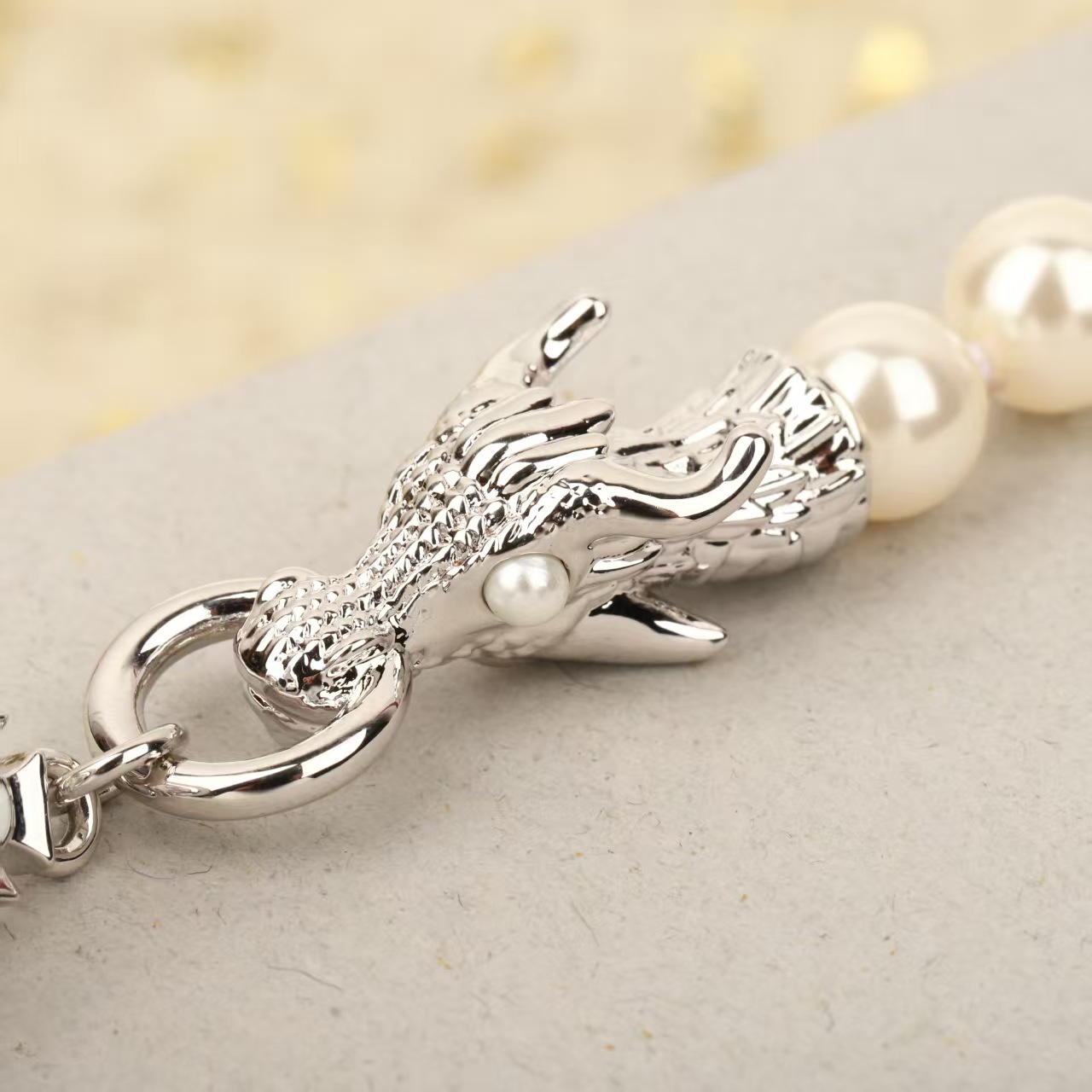 It features a strand of lustrous white pearls. The focal point is a detailed charm design that includes a dragon motif and the brand’s iconic orb pendant, available in silver – toned and gold – toned variations.