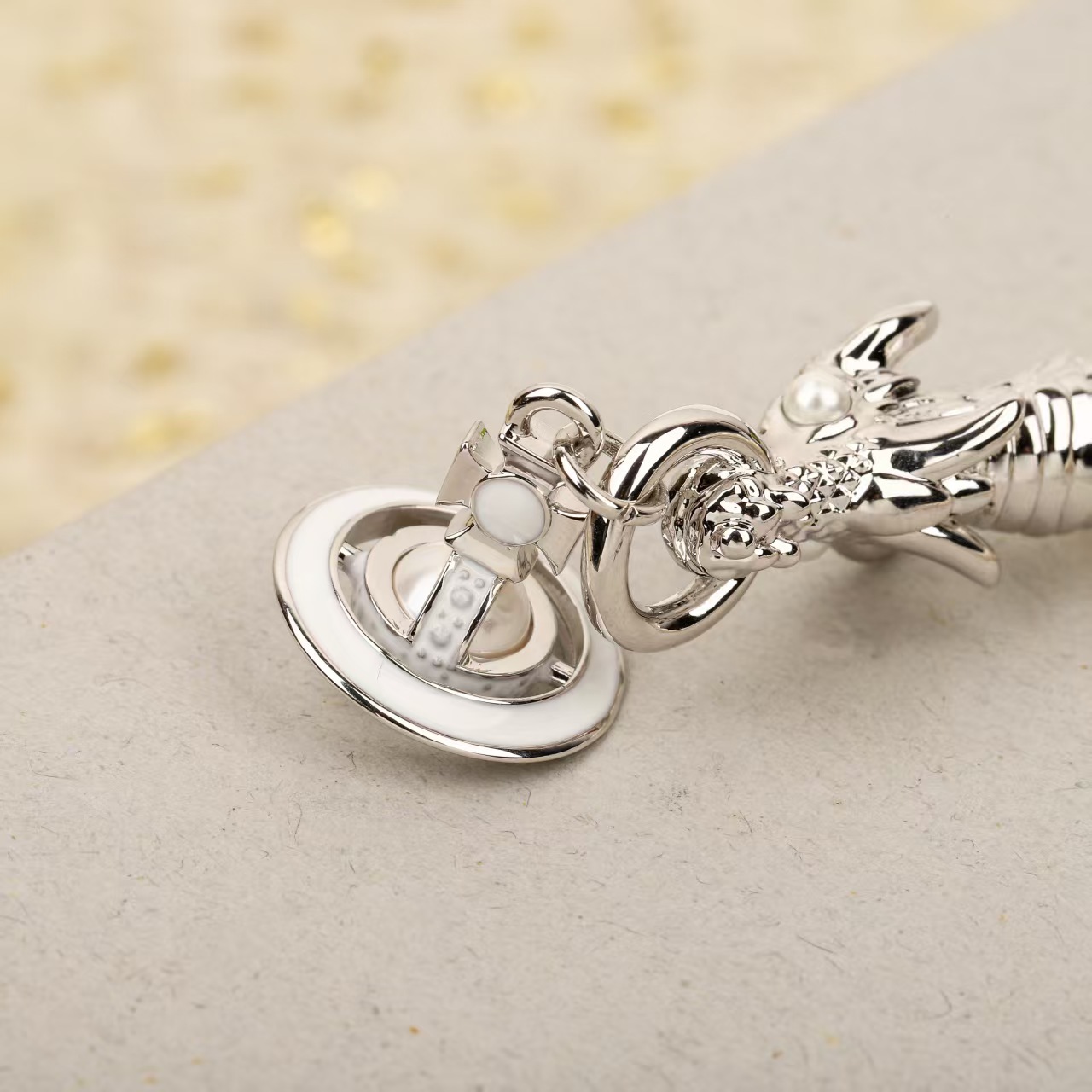 • The focal point is a detailed charm design that includes a dragon motif and the brand’s iconic orb pendant, available in silver – toned and gold – toned variations.