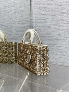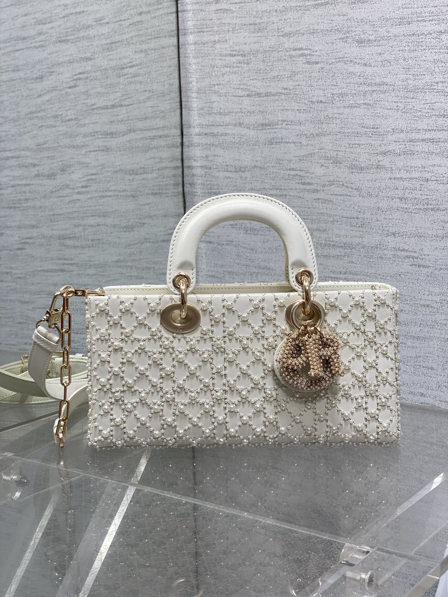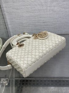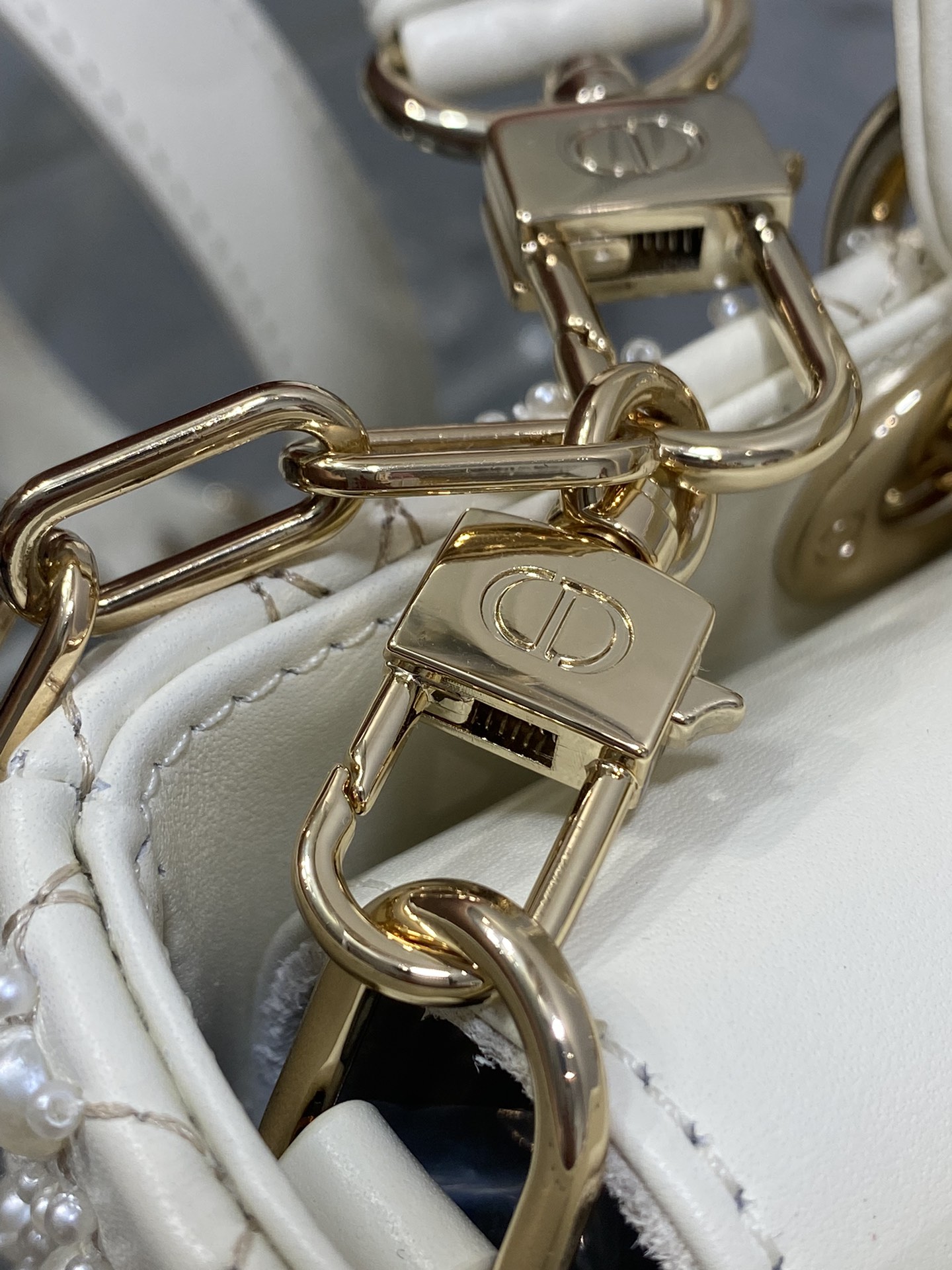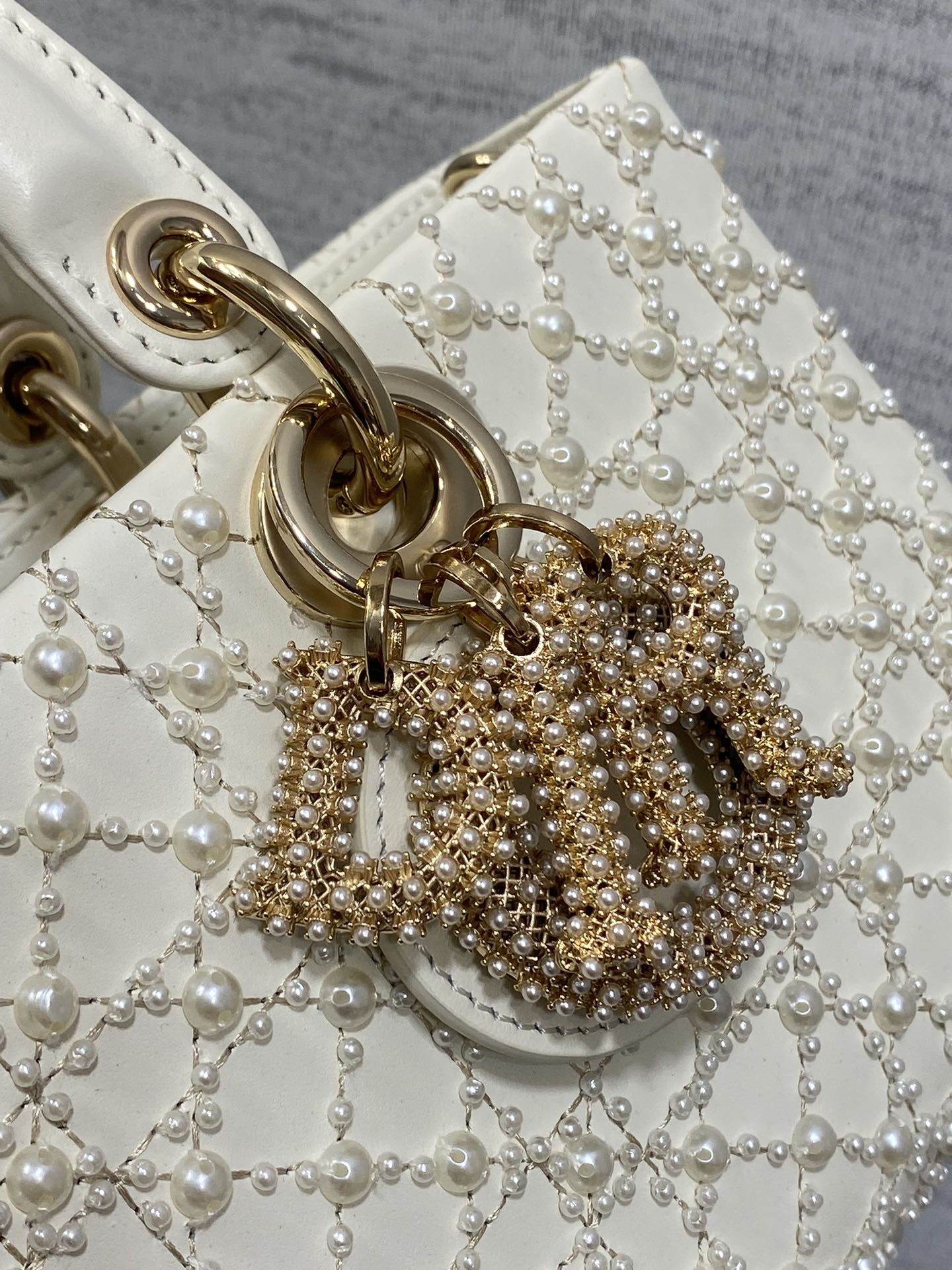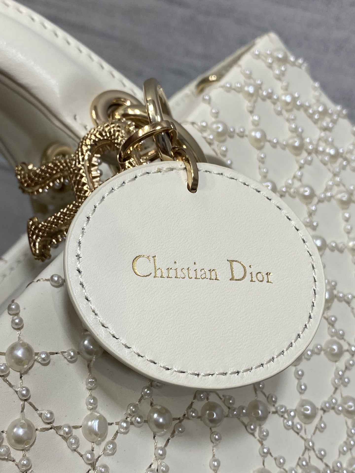 • It is finished with polished gold-tone hardware, including a standout pearl-encrusted “DIOR” logo charm (matching the bag’s pearl motif) attached to the top handle.
